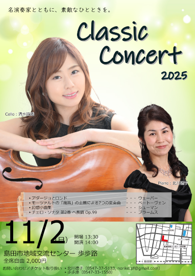 ヴァイオリン奏者の横山奈加子さんをお迎えして、島田市の地域交流センター 歩歩路(ぽぽろ)にて「Classic Concert 2019」を開催しました。